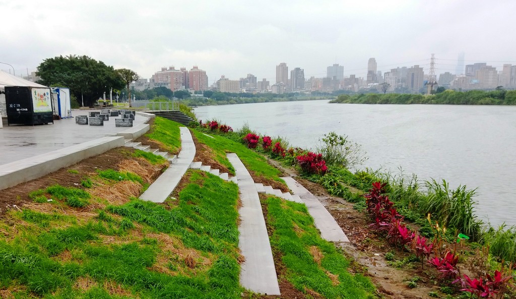 而來到河濱公園,當然不能錯過無敵河岸美景!舊有的河岸側混擬土座階,因為自行車道逼近河岸,造成壓迫感,所以鮮少人駐足停留;為了讓更多人能親近河岸,水利處揮別生硬的混擬土座階,換上寬度約60-70公分寬草坡,民眾或坐或躺都舒適多了,可以盡情享受新店溪美景,夜晚還能遠眺101大樓。