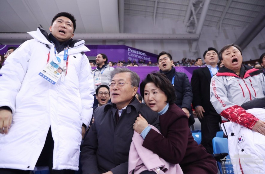 最後南韓女將崔珉禎成功在女子短道競速滑冰1500公尺奪金,文在寅立即開心地跳了起來,揮手向選手祝賀,金正淑則是手拍了胸口幾下,一臉鬆了一口氣的感覺,2人可愛又自然的互動立即在網路上引起討論,相關照片青瓦台也分享在官方社群網站上,表示總統不僅知道每個選手的名字,當晚還和群眾玩起人浪,一起幫南韓選手加油。