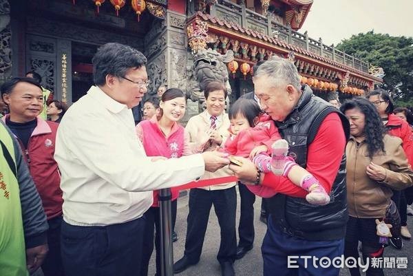 ▲年假最後一天,鄭文燦率市府團隊到11宮廟參香、送福袋。(圖/桃園市政府提供)