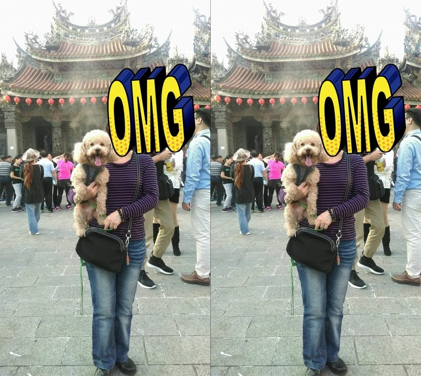 照片中可以看到,原PO的媽媽抱著可愛的貴賓站在廟前,但狗狗的頭上卻因後方香爐的煙而浮現出像「黃金獵犬」、「拉布拉多」的影像,讓人非常困惑。