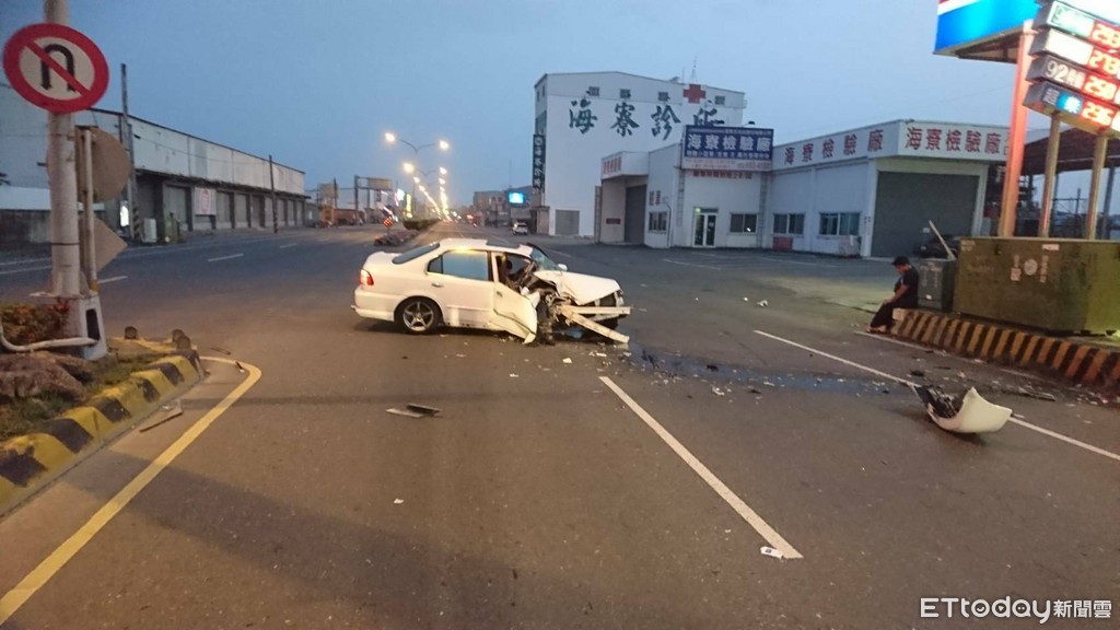 ▲23歲鍾姓男子涉嫌酒駕自撞電信箱,連同其同車友人受傷送醫,車體嚴重毀損。(圖/記者林悅翻攝)