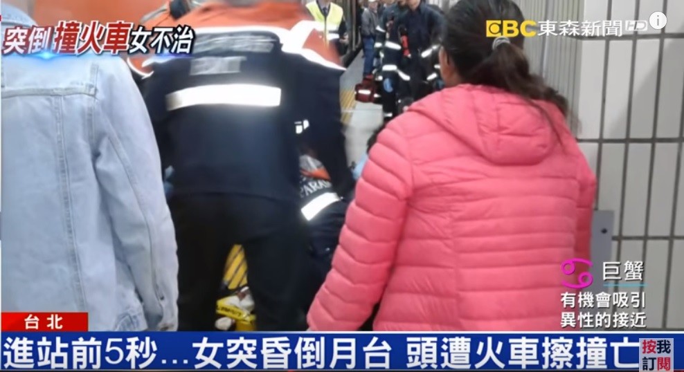 台鐵272次自強號於21日上午7時29分駛入台北站,但站在第4月台處的一名女性旅客,卻在列車進站前5秒突然昏厥並向前傾倒,肩膀以上超出月台懸在鐵軌上空;當時自強號列車長發現異狀,雖然緊急剎車但仍是來不及,車頭直接撞上女子、往前滑行約20公尺才停下。
