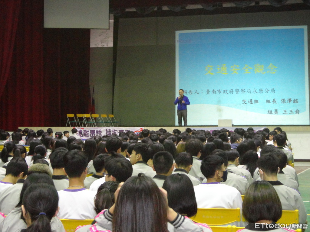 ▲台南市永康分局交通組組長張澤銘、警員王玉俞,前往南大附中,針對一年級學生,作交通安全專題宣導,宣導路權觀念與交通相關法令等正確認知。(圖/警方提供)