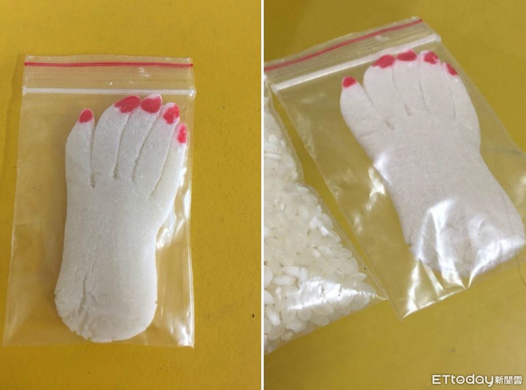 黃姓網友臉書「爆廢公社」PO出幾照片,從畫面中可以看見,密封袋內裝著類似粿製成的小手,手掌有多處龜裂,指甲處還塗上大紅色的顏料,猶如血爪一樣;而且手指長度相當詭異,大拇指竟然長到食指第一節,小拇指還與食指、中指、無名指一樣長,模樣相當古怪。