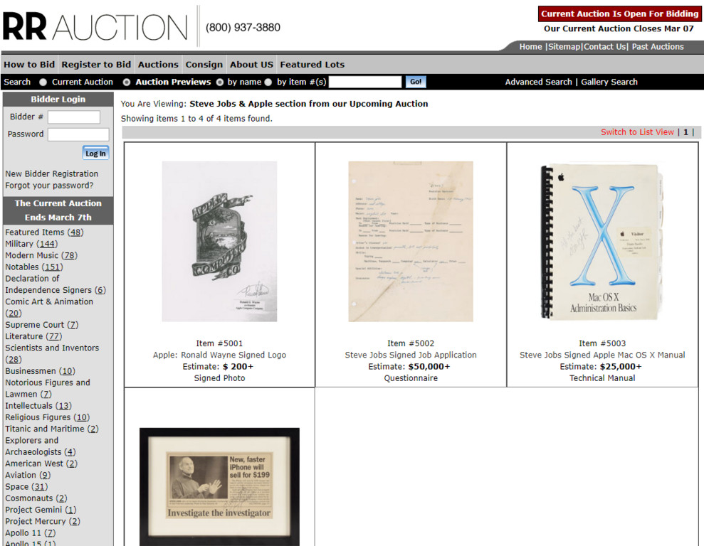 這封求職信將在3月8日到15日,和其他相關競標品一同納入由「RR Auction」舉辦的流行文化拍賣。其他相關的拍賣品則有:2001年賈伯斯親筆簽名的Mac OS X操作手冊、2008年蘋果發表會上,由賈伯斯簽名的報紙、一本賈伯斯簽名的雜誌,以及一些賈伯斯的私人物品。