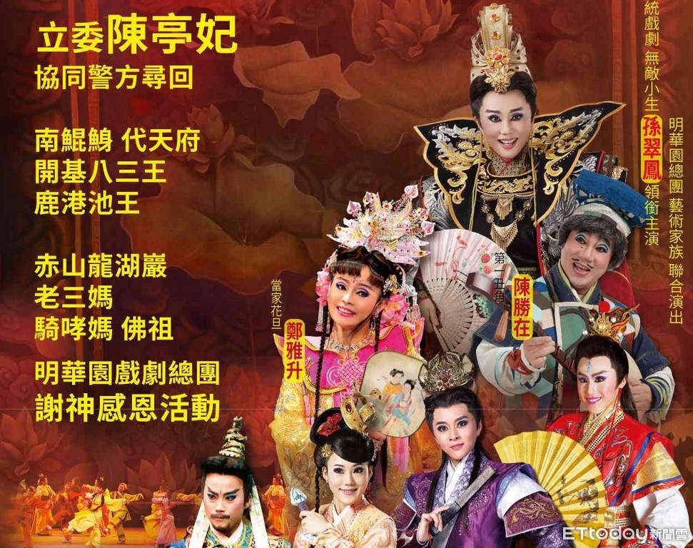 ▲台南市議員趙昆原服務處、代天府、龍湖巖、新營太子宮、鹽埕北極殿,24日晚上7時共同舉辦謝神感恩戲,由明華園總園孫翠鳳領銜演出。(圖/記者林悅翻攝)