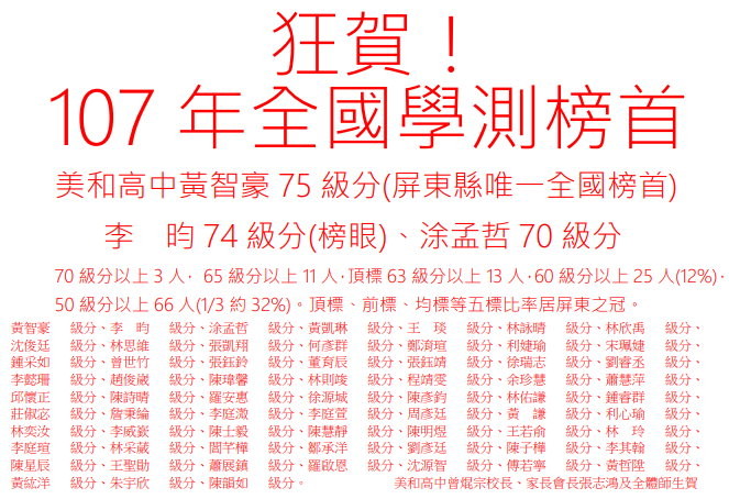 大考中心23日公佈107年大學學測成績,屏東縣私立美和高中的黃智豪是全屏東縣唯一滿級分,也是創校40年來,第一位考滿級分的考生,校方特地在官網貼上大大的紅榜。黃智豪表示,父親小時候因延誤就醫而殘疾,當醫生成為他努力的動力,希望能幫助更多人 。
