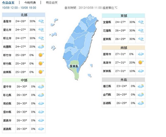 ▲8日台灣各地天氣預測12:00-18:00。(圖/取自氣象局網站)