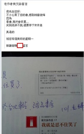 知名作家侯文詠在臉書擁有37萬名粉絲,8日轉貼一封幽默的讀者來信;一位陳小姐寫道,「不小心買了您的書,感到相當後悔,因為看書,竟然會好累...到流淚不說,還要停下來休息,真是的,祝您有個美好的星期一。」