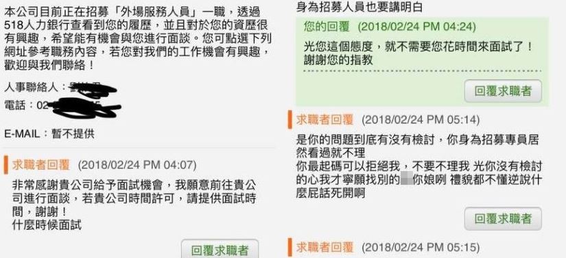 招聘的一方看見誇張的來信後,則回應「光您這個態度,就不需要您花時間來面試了!謝謝您的指教」。而求職者還不肯善罷甘休,直說這一切都是對方的問題,怎麼可以已讀他人的信件,連拒絕都沒有,「光你沒有檢討的心我才寧願找別的X他娘咧,禮貌都不懂逆(你)說什麼屁話死開阿」。