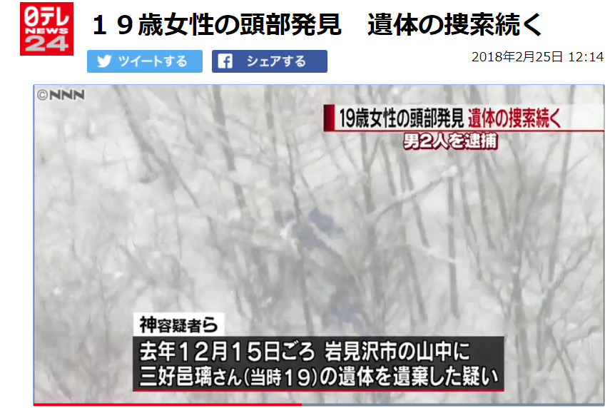 綜合日媒報導,被捕的2人分別是經營餐飲店的神智慶與長谷川剛拓(皆31歲),2人涉嫌殺害三好邑璃,並將屍體遺棄在荒山中。其中一名嫌疑人坦承參與棄屍,警方根據口供到岩見澤市山區搜索,果然在雪堆中發現死者頭顱和毛髮,預計將在周圍持續尋找。