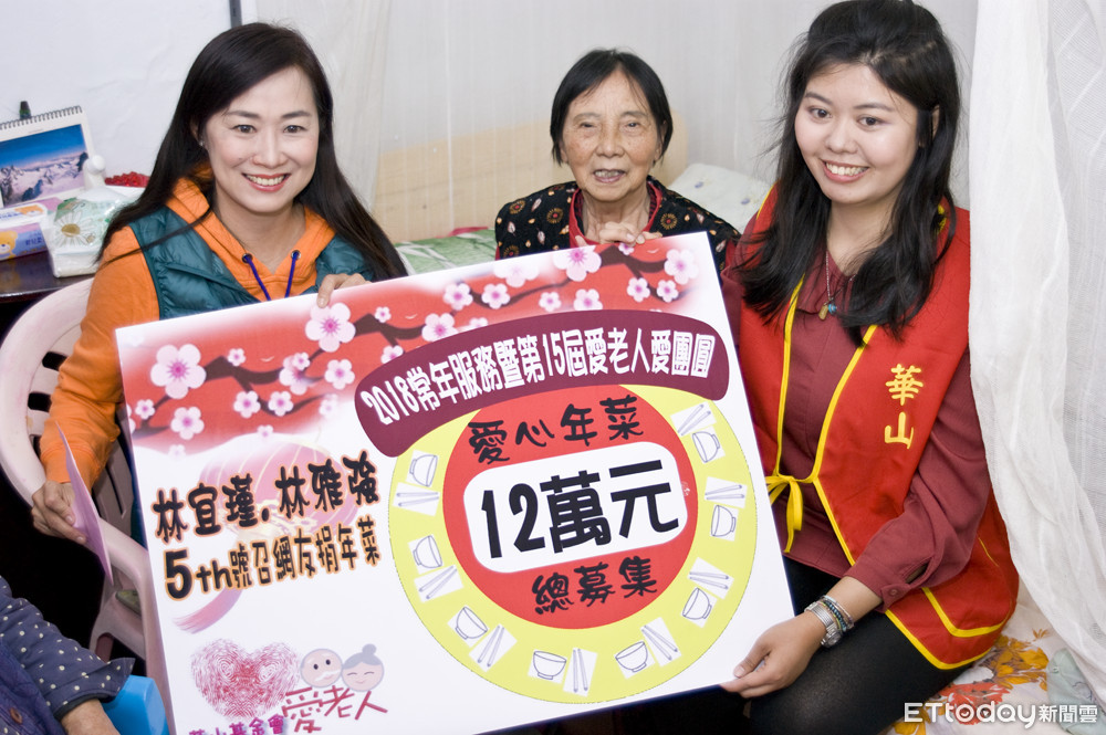 ▲台南市議員林宜瑾(左一)與網路名人A濫林雅強,接連五年不中斷,號召愛心網友為失智、失能、或失依的三失長輩募集年菜共計12萬元。(圖/華山提供)