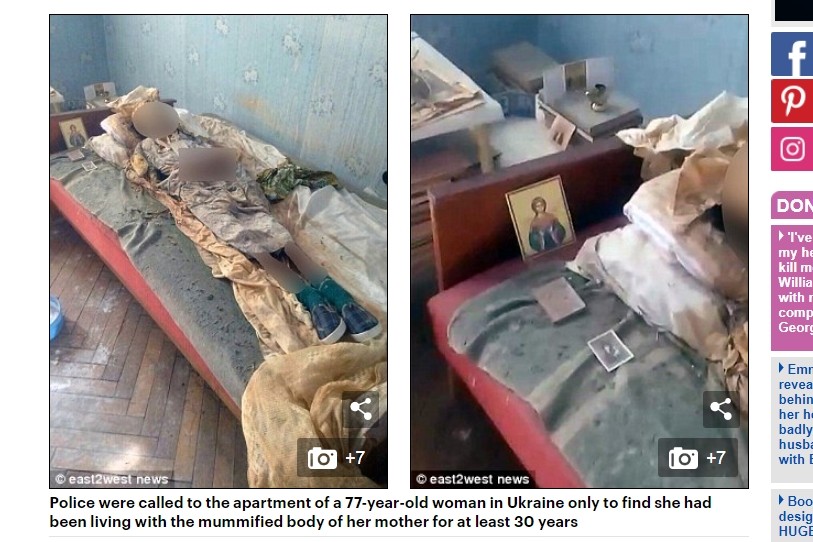 這起事件發生在烏克蘭南部的尼古拉耶夫(Mykolaiv),當地警方表示,他們接到鄰居的報案,於是到這間公寓查看,進門後發現一具乾屍躺在沙發上面,旁邊堆滿了報紙和大量的垃圾,看起來就像廢墟,還有許多類似宗教儀式所使用的物品,這具屍體甚至還穿著一件白色的洋裝,綠色的襪子和藍色的鞋子。