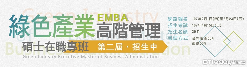 國立台東大學以優質的教學型大學為基礎,配合地方產業發展需求,並落實政府『5+2』產業創新計畫推動,提供產業及中小企業主一個優質環境品質的進修管道,將於107年度招收第二屆綠色產業高階管理(EMBA)碩士在職專班,本年度共招生20名學員,報名自107年2月1日起至3月23日止。