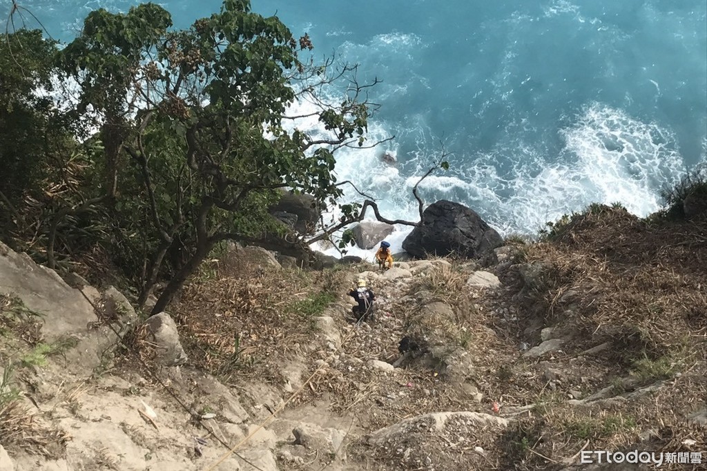 ▲蘇花公路台九線170.1公里處,1名男子疑似摔落下邊坡100公尺處,警消獲報垂降將男子救起時已無呼吸心跳,送醫急救仍不治。(圖/花蓮縣消防局提供 下同)