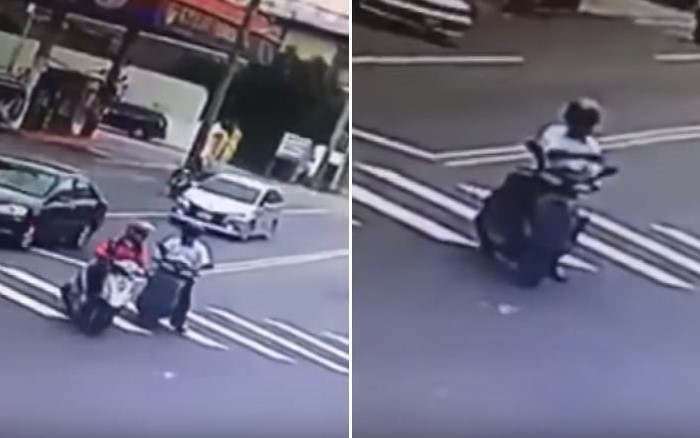 在這段短短17秒的影片中,阿伯在一開始就已經逆向騎在對向車道的內側,似乎是想閃開前方的3輛轎車,沒想到就在經過路口的時候,第一輛車和第二輛車之間的縫隙突然鑽出一名女騎士,還直接「無視」他從前方硬切左轉。
