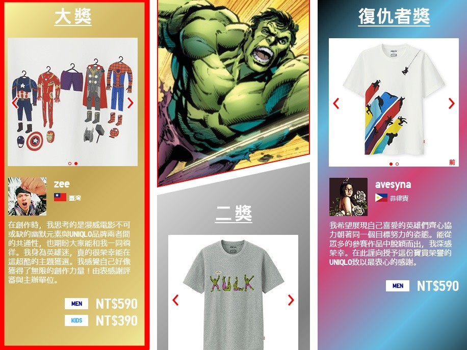 得到「UT GRAND PRIX 2018」大獎的台灣設計師「zee」,也分享得獎感言,在創作時,思考的是漫威電影的幽默元素與Uniqlo品牌兩者間的共通性,「我身為英雄迷,真的很榮幸能在這超酷的主題獲選。我感覺自己好項獲得了無限的能量,由衷感謝評審與主辦單位。」