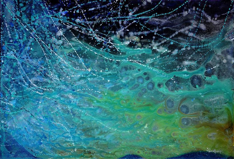 做為首次個展,她大玩壓克力顏料,嘗試加入不同媒介,色彩層層堆疊流動交融,有些畫面在具象與抽象間,有些極度抽象,但都能在她的掌握間,雖然技巧未必令人驚艷,但色彩處理有相當的空間,不失自然天成之美的感覺。完全不做作,以色彩為媒介刺激觀賞者對色彩的敏感需求。
