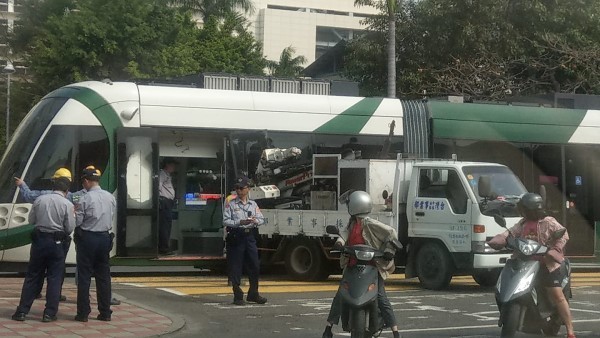 ▲高雄輕軌又發生意外,一輛違停貨車與列車相撞。(圖/取自臉書爆料公社,下同)