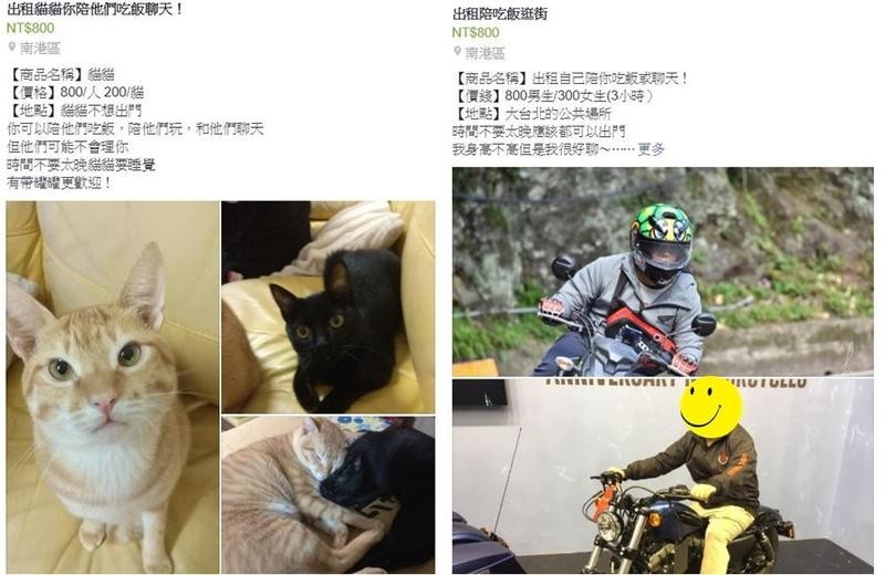 除了留言串以外,最吸睛的就是網友接下來一連串的模仿出租po文,有網友出租自家萌貓,陪玩陪照顧一小時也是800元,賣家「貼心」清楚寫明「但貓可能不會理你」;也有男性網友出租自己陪聊天、慢跑,他可以陪講幹話,也可以幫忙把你吃不完的早餐午餐晚餐都吃完,也模仿原po寫「地點不要太奇怪,不然我一個肥宅會怕」。