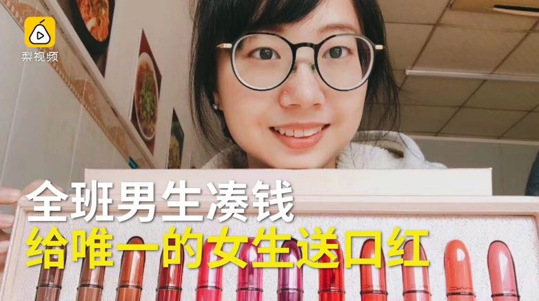 廣東廣州華南理工大學大一機械三班的男生,7日合體送全班唯一的女生陳文淇一盒M.A.C口紅,並寵溺的說,「肯定會給班花送最好的東西!」陳文淇則說,身為班上唯一一個女生,開學至今,「幾乎連喝水都不用自己開瓶蓋。」
