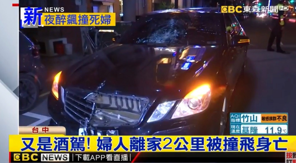 台中一名21歲的駕駛10日凌晨和4名友人在酒吧喝酒後,硬要開車,並在台灣大道狂飆,開到中華路口時,撞上一名王姓女騎士,女騎士遭撞飛落地當場沒有生命跡象,送醫後仍不治,女騎士原來是台中50年太陽餅店的老闆娘,每天負責關門,當時正要回家卻被酒駕撞死,他的酒測值為0.75毫克,已經明顯超標。