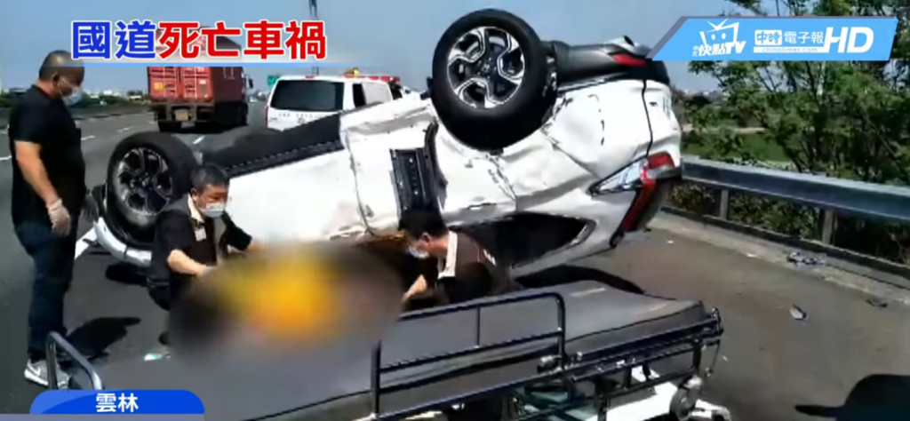 國道1號(中山高)雲林虎尾路段10日發生死亡車禍!一輛黑色BMW急剎切換車道,失控撞上休旅車Honda CRV,造成CRV翻覆,車內2大3小1死4傷。警消發現,5人全都沒繫安全帶,38歲女駕駛載著閨蜜和3個小孩出遊,未料遇上死劫,前座的閨蜜頭部變形,當場慘死,6歲兒子當場痛失親人,不斷哭喊找媽媽。