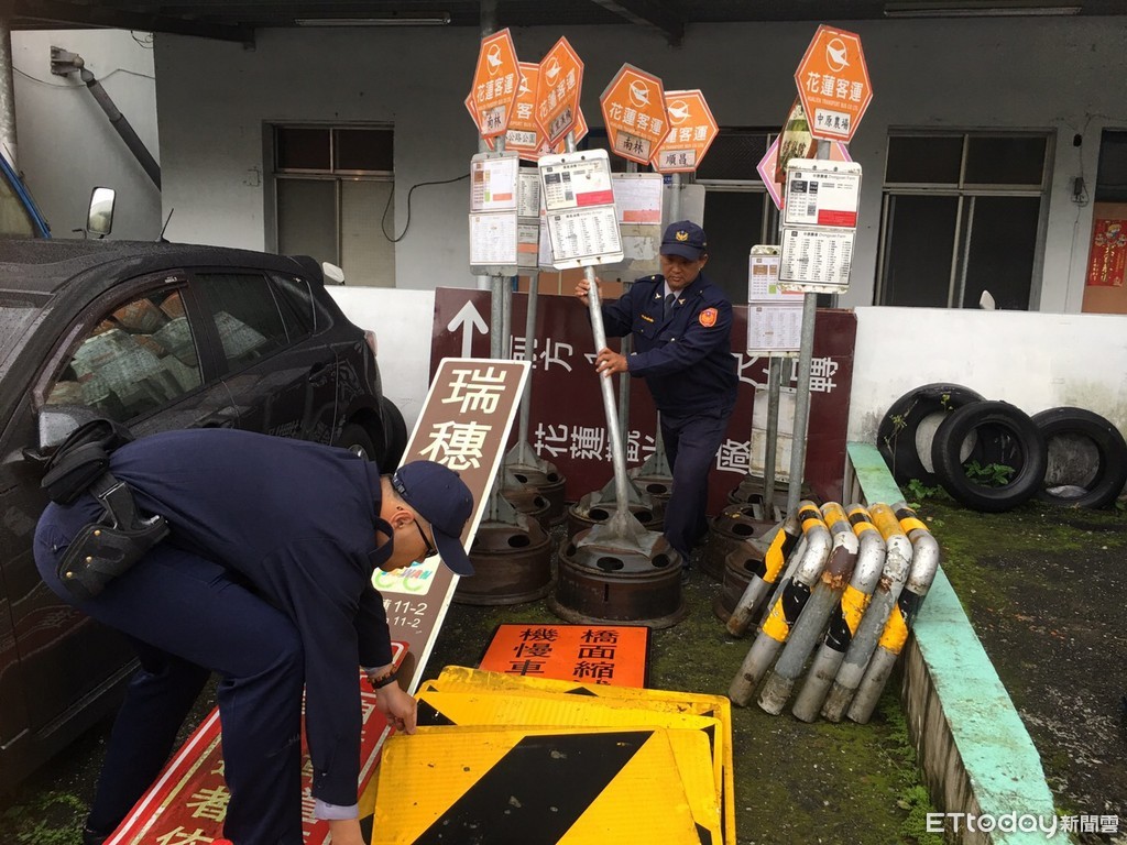 ▲警方在鄭嫌車上發現竊得的物品,包括花蓮客運公車站牌、省道道路反光指示牌、自行車道專用指示牌、光復糖廠之告示牌、林田山豬腳之廣告牌,警察人型看板等多樣鐵製品,一一通知被害人領回依法偵辦。(圖/花蓮縣警察局提供 下同)