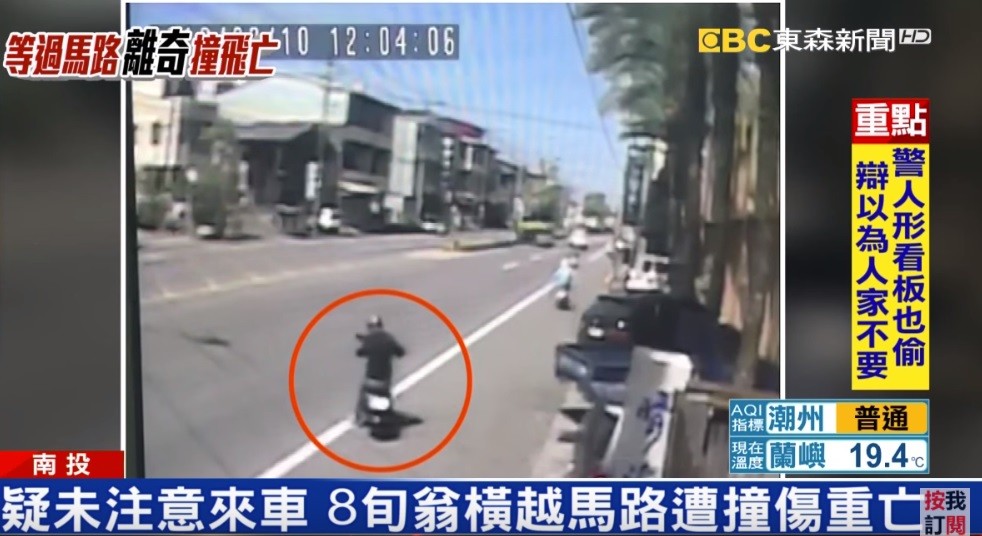 監視器畫面拍下,李姓老翁騎著電動車停等在馬路旁不斷回頭張望,後方還有另一騎士也在等候車流量稍減,準備橫越馬路,但無奈來車太多,後方騎士最後放棄繼續前行;而仍在原地等候的李翁不久後見到空檔,立即驅車跨越馬路,不料李翁疑似未注意到內側車道的白色休旅車駛來,當場被撞個正著。