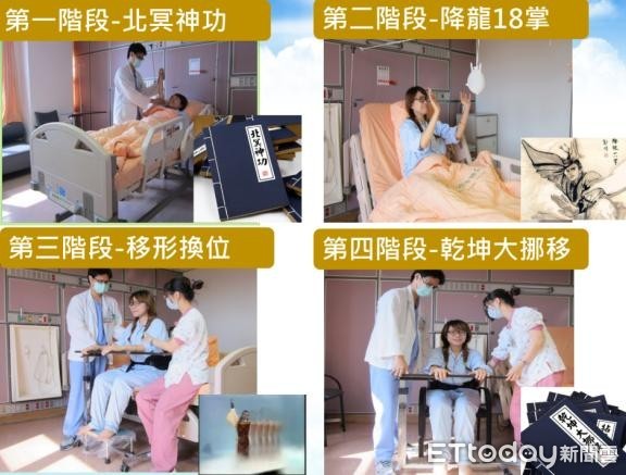 結合「武功祕笈招式」,分別為第1、2階段在床上的被動關節運動(北冥神功)及60至90度坐姿的主動關節運動(降龍十八掌),第3階段無背部支撐坐在床邊的持續式呼吸肌訓練(移形換位)及第4階段移位至床邊陪伴椅之肌肉訓練(乾坤大挪移)。