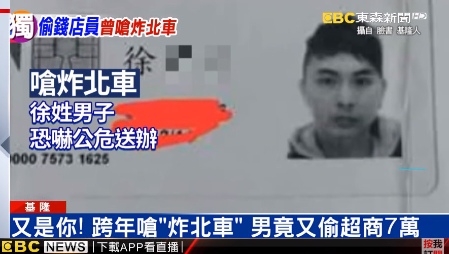基隆市一名徐姓男子應徵超商大夜班工作,上班才第5天,10日趁著沒有人的空檔直接搜刮櫃檯的現金,包括代收的水費與電費,拿了一疊厚厚的鈔票就跑,竊走了現金6萬6000元逃逸;事後調查,徐男竟曾在去年跨年夜前夕於臉書上放話要炸掉台北車站。