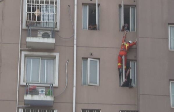 ▲陳姓消防員冒險從9樓垂降,總算成功救下企圖跳樓的婦人。(圖/翻攝自揚子晚報網)