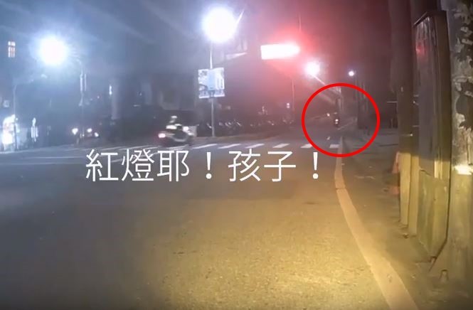 影片中,原PO前方的兩台機車並排停等紅燈,左邊的騎士一看到號誌燈轉為綠色,馬上催油門衝出去,雖然騎到下一個路口前有稍微煞車,但可能是因為前方沒有其他車輛加上時間很晚了,他乾脆心一橫加速往前衝過紅燈。