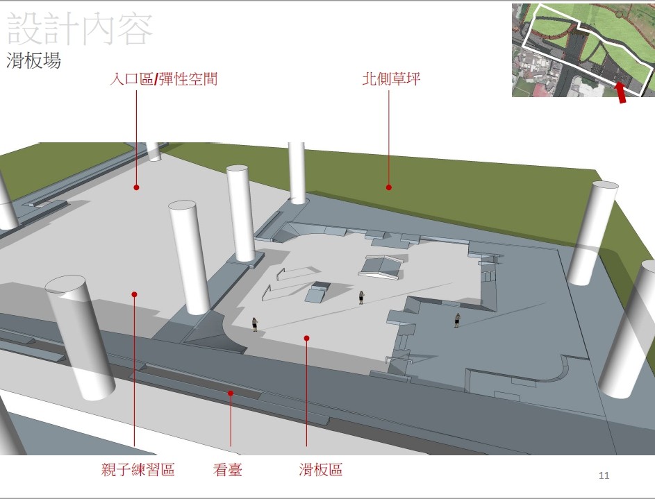 滑板公園將設置於橋墩下,可有效阻擋夏日豔陽,滑板迷即使在盛夏也能盡情使用,場地設置火山台、三面台、A字台、J台、斜坡道、階梯等相關設施,乘著滑板能從不同角度的場地表面,充分享受起跳、翻躍、沿障礙物橫刷板身,或空中翻板的飛馳快感。去(106)年滑板運動也已獲國際奧運委員會(IOC)納入運動項目之一,2020年東京奧運會將首次登上舞台,滑板公園今年完工後,市民朋友可搶先體驗,運動視野與國際接軌。
