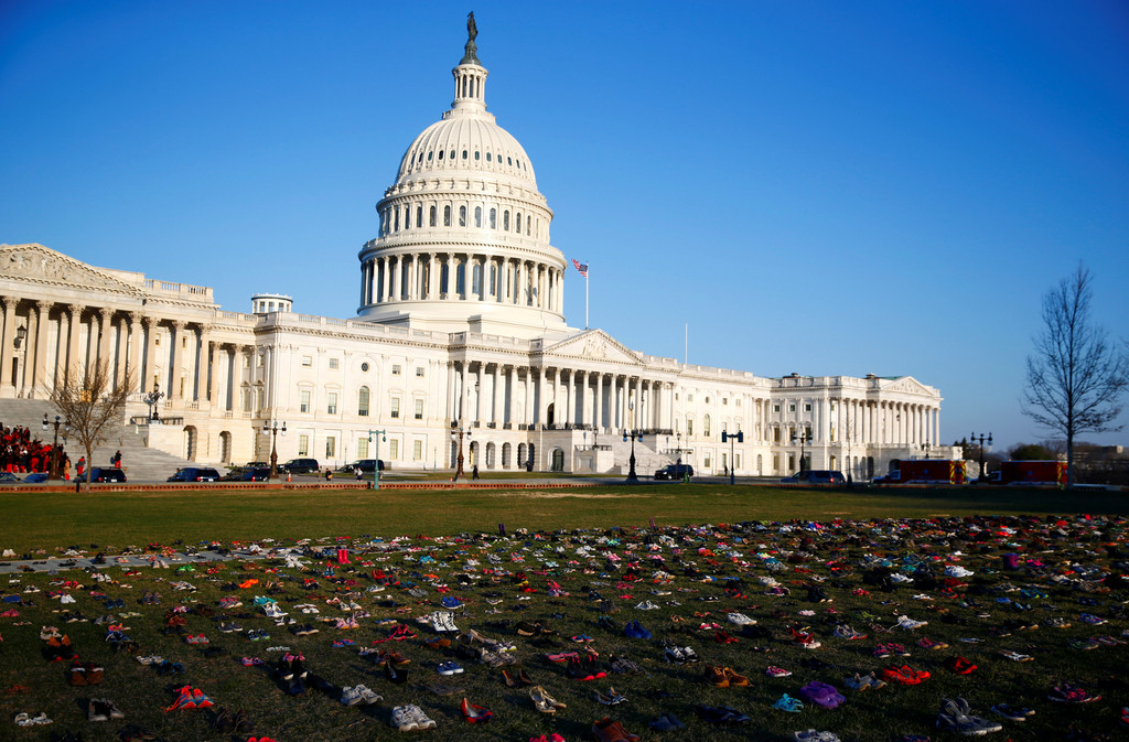 美國近年校園槍擊案頻傳,許多民眾13日上午再度走上街頭呼籲嚴管槍枝,在國會大廈外的草坪留下超過7000雙鞋子,紀念自從2012年康州小學大屠殺事件以來,所有命喪槍下的兒童。