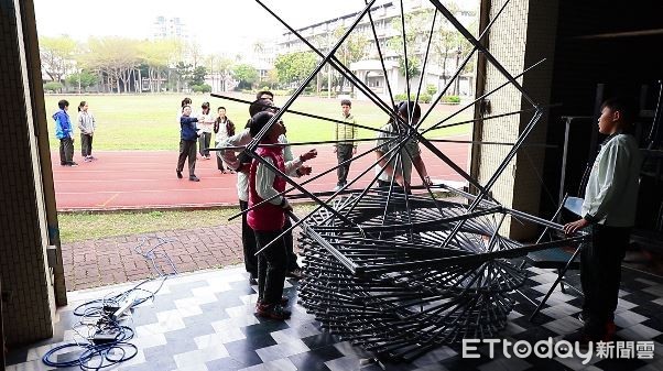 高年級小朋友用水管組成100X100公分的正方形,再將每個正方形以螺旋狀方式排列成規律的幾何立體結構,搭建出50層的聖火台底座;聖火台的火炬則是以LED燈取代,小朋友運用數學幾何觀念,將16支LED燈平均佈置為放射狀,並應用自然課的串聯並聯知識,透過控制器讓LED燈光彩奪目,最後再將底座和燈飾上下組合起來並固定,才算大功告成。