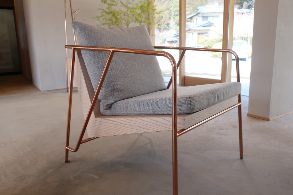 穴井俊輔所設計的傢俱,一定會有玫瑰銅的元素,這也讓人覺得好奇。仔細問了下才發現,原來小國杉的特色是斷面從圓心向外,會有一層桃紅色的木心,為了表現這樣的質感,於是他就把玫瑰銅置入其中。