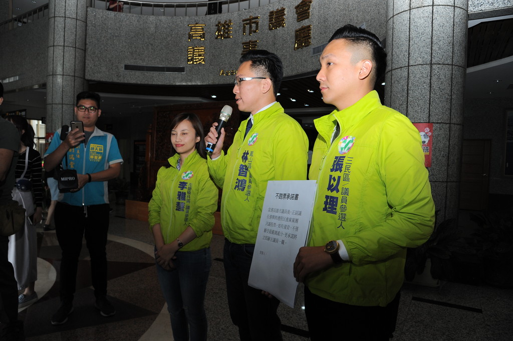 高雄鳳山區市議員參選人林智鴻、三民區市議員參選人張以理,以及左楠區市議員參選人李雅慧,15日上午一同前往高雄市議會拜會議長康裕成,三人共同表示支持康裕成連任議長,簽署承諾書宣示正副議長選舉不跑票決心。