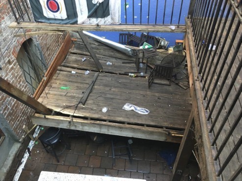 據《CNN》報導,紐約市消防部門在推特上發文指出,薩凡納市中心一間名為「Rogue Water Tap House」的酒吧,周六下午發生陽台坍塌意外,當時坐在陽台下方的2人遭長寬約3.6公尺(各12英尺)的陽台甲板重擊受傷。