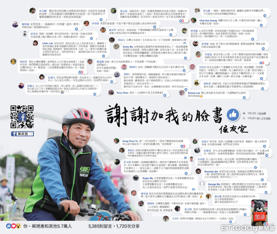 新北市長參選人侯友宜19日在平面報紙刊登廣告,感謝民眾熱情相挺,廣告沿用宣布參選當天臉書的照片,騎著腳踏車一路向前,另外擷取多個民眾的支持鼓勵的留言。當天這則臉書吸引5萬7千人按讚,5385則留言,1720次分享,是侯友宜臉書的新高紀錄。