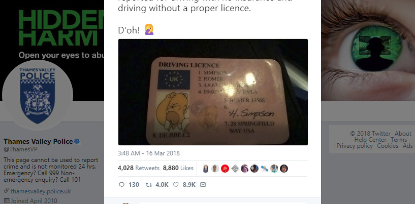 Thames Valley的警方16日在推特上貼文說,「在這個禮拜,我們攔下了一台車子,想要驗證這名駕駛的身分,結果我們警方發現,他的車子被查封而且沒有保險,並且駕照有問題。」警方還搞笑的在結尾寫下,D'oh!(常被翻譯為「看!」、「該死!」或「噢!」,通常在荷馬走霉運或受傷的時候會不由自主的說這句話。)