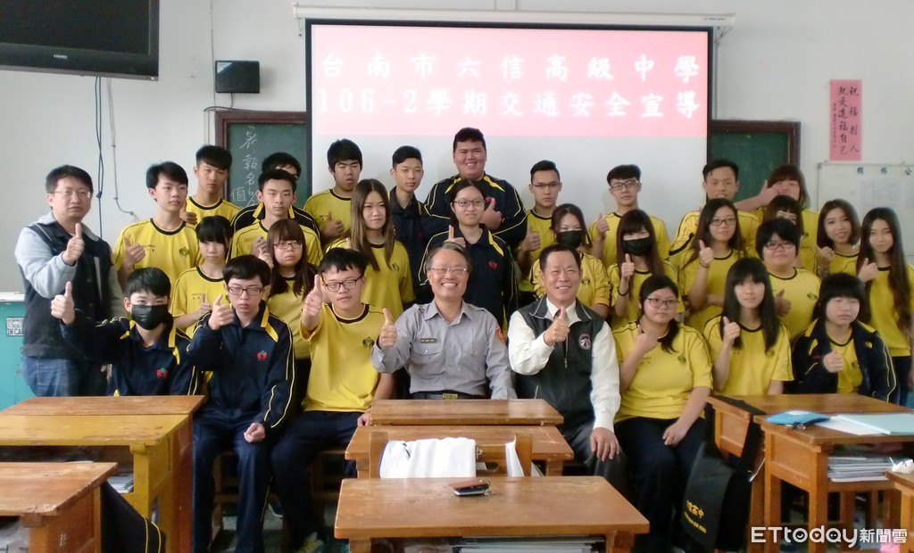 為落實交通安全常識從校園出發,台南市警六分局交通組長蔡文榮,受邀前往台南市南區六信高中,和校長黃文生、教官周揚文等人,共同實施交通安全宣導,提醒師生注意交通安全。
