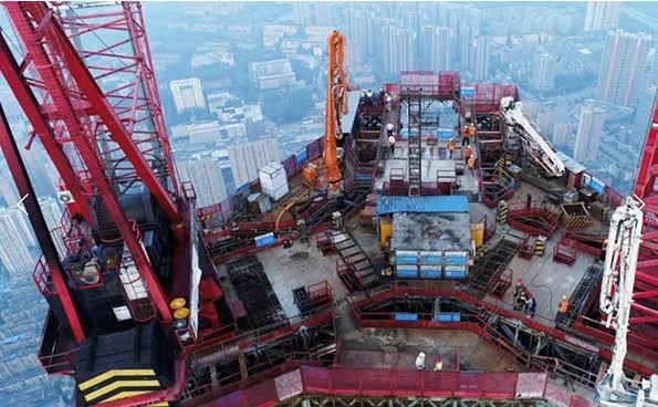 一般而言,300公尺是超高層建築的重大門檻,500公尺則是另一道更難的關卡,建設風險會比300公尺高樓大了4倍,因此建築平台的穩定性相當重要。然而,武漢綠地中心正在建設的工程,「空中造樓機」是一個四周都封閉的移動工廠,它停靠在高空499公尺,本身重量加上鋼筋、混凝土和塔吊等重型裝備和物料,總重高達4000噸,相當於3000輛小汽車的重量,但是它只花5個小時,整體就頂升了4.5公尺,突破力驚人!