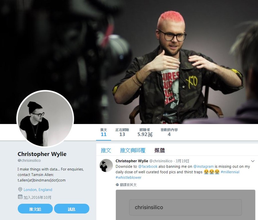 ▲懷利過去蒐集用戶資料,進一步分析他們的心理,藉此讓競選團隊操控。(圖/翻攝自推特/Christopher Wylie,下同)
