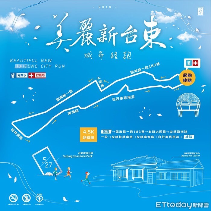 為推廣客家文化並倡導運動風氣,台東市公所與台灣全民運動協會攜手打造首屆「美麗新台東城市路跑」,賽事於5月27日當日6時正式開跑,報名時間自即日起至4月14日截止,報名成功者有紀念T恤及慢跑鞋好禮相送,完賽跑友另可獲得完賽證明及精美獎牌並參加抽獎。