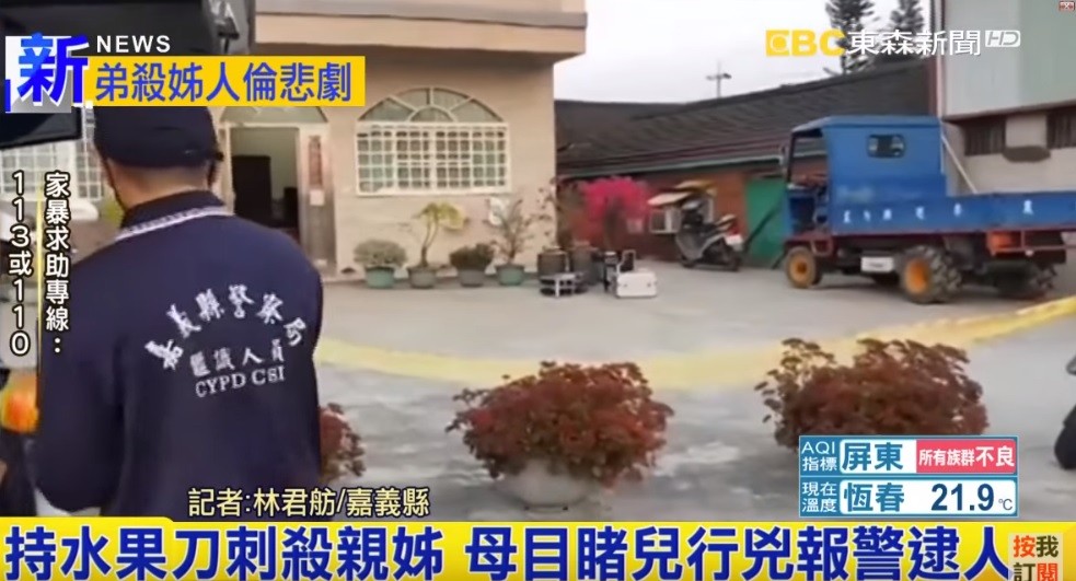 嘉義縣民雄鄉福權村24日下午2時許發生一起駭人聽聞的凶殺案,40歲的賴姓男子疑似精神狀況異常,竟手持水果刀朝45歲的胞姊猛刺。案發當下賴母雖然在旁,但卻無力阻止,只能奪門奔出求救,不料待她再回到家中時,女兒早已被兒子刺殺身亡,家裡遍地鮮血;更驚悚的是,警方稍早還證實,死者賴女遭弟弟猛刺、「刺到斷頭」,目前全案深入調查中。