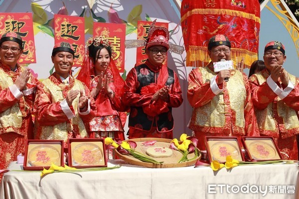 新人並依循傳統禮俗過程,納彩、問名、納吉、納徵、請期親迎等,娶親隊伍一路爆竹鑼鼓喧天,動員親友團、區里民相挺,現場拜堂合巹(喝交杯),桃園市長鄭文燦也出席證婚,與新人共同壓印百年糕餅老店郭元益傳統大餅,現場分送遊客、分享幸福,讓溪海休閒農業區猶如辦了一場前所未有盛大婚宴(圖/農業局提供)。