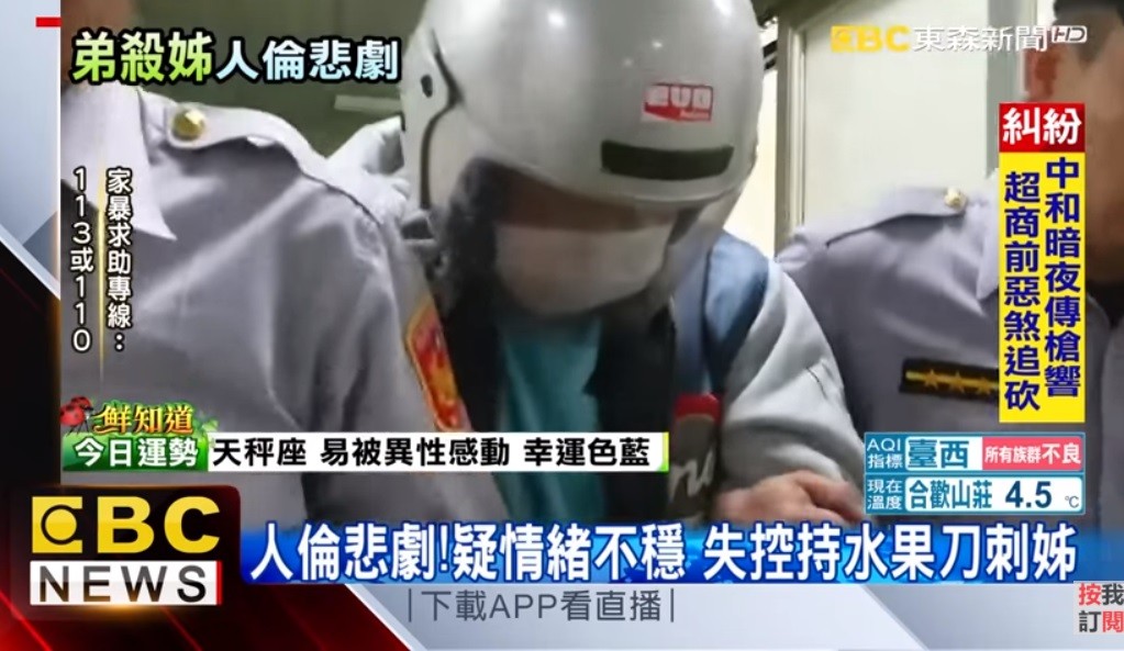 嘉義縣民雄鄉福權村一名領有輕度精障手冊40歲的賴姓男子,24日下午疑似精神狀況不穩,手持水果刀衝進浴室朝45歲的大姐猛刺,幾乎斷頸,母親目睹嚇得跑出門外求救,警消到場時,賴姐已經當場死亡,他則坐在客廳喃喃自語, 25日上午由律師陪同作筆錄時說,「我看到沒有頭的人,她是鬼,不是我姐姐。」