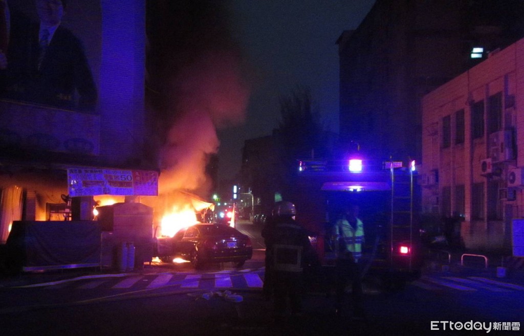 ▲轎車失控撞攤販起火。(圖/記者莊雅婷翻攝,下同)