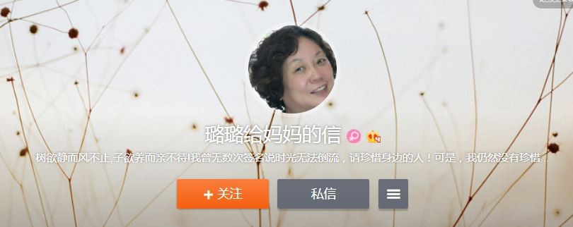 璐璐每篇文章第一句都以「媽」開頭,讓許多網友看了為之鼻酸。據悉,璐璐的微博簡介為「樹欲靜而風不止,子欲養而親不待!我曾無數次簽名說時光無法倒流,請珍惜身邊的人!可是,我仍然沒有珍惜住,還是留下了太多的遺憾!」